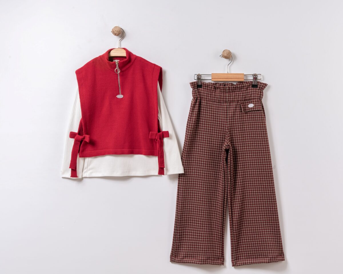 3-teiliges Outfit – Karohose, Rollkragen & Strickweste