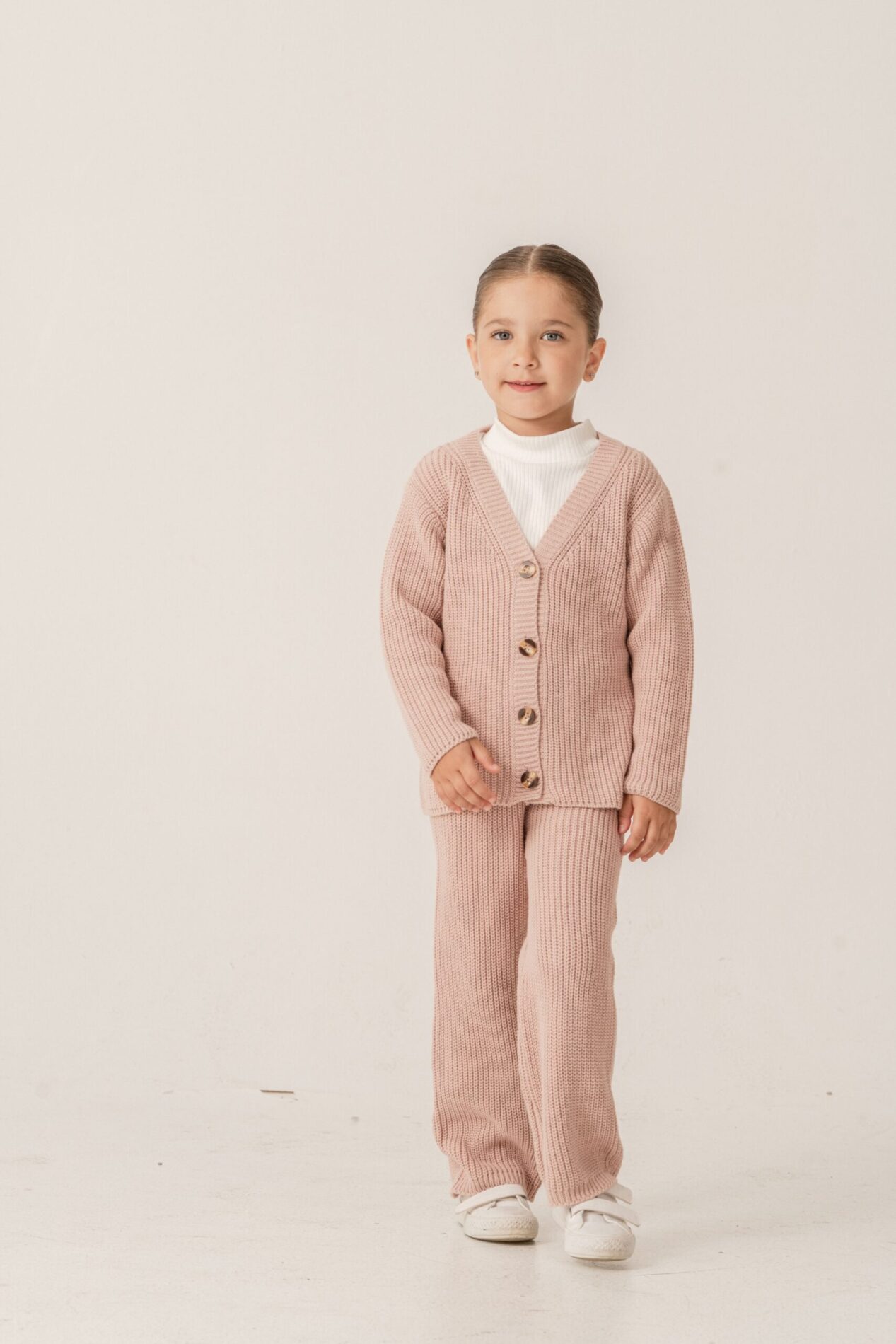 3-teiliges Strickset – Weißer Rollkragenshirts, Cardigan & Breite Hose