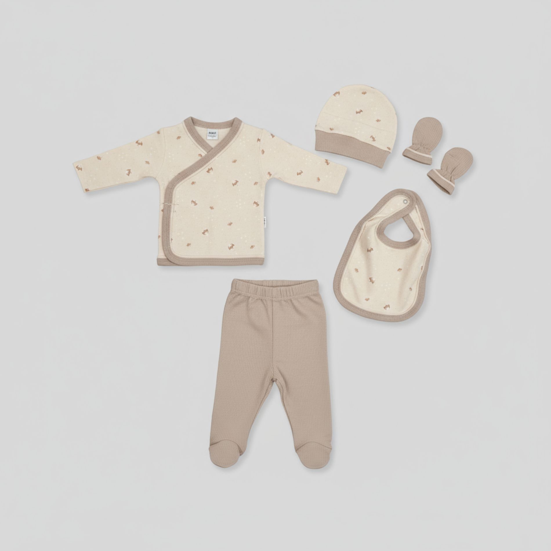 • Wickelshirt, Hose mit Fuß, Mütze, Lätzchen und Fäustlinge