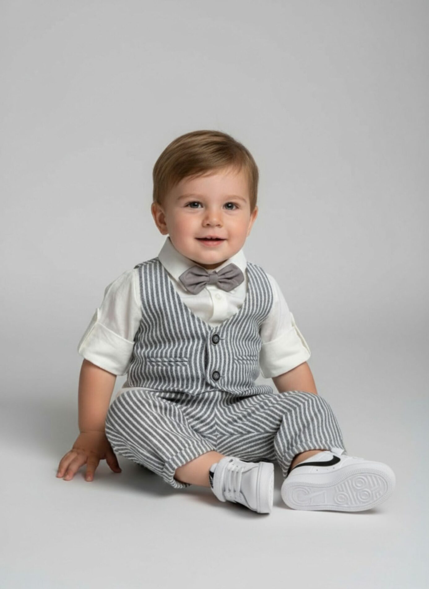 • Cremefarbenes Hemd mit grau-weiß gestreifter Weste und Hose