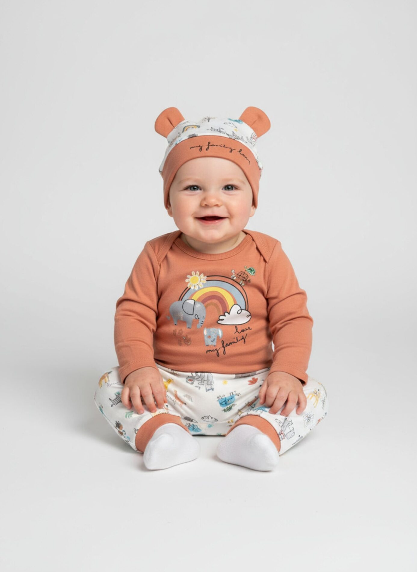 - Body in warmem Terracotta, Hose und Mütze in Weiß mit bunten Tiermotiven