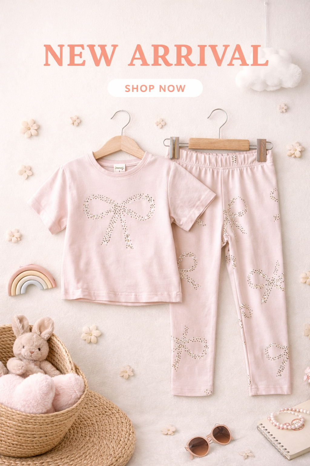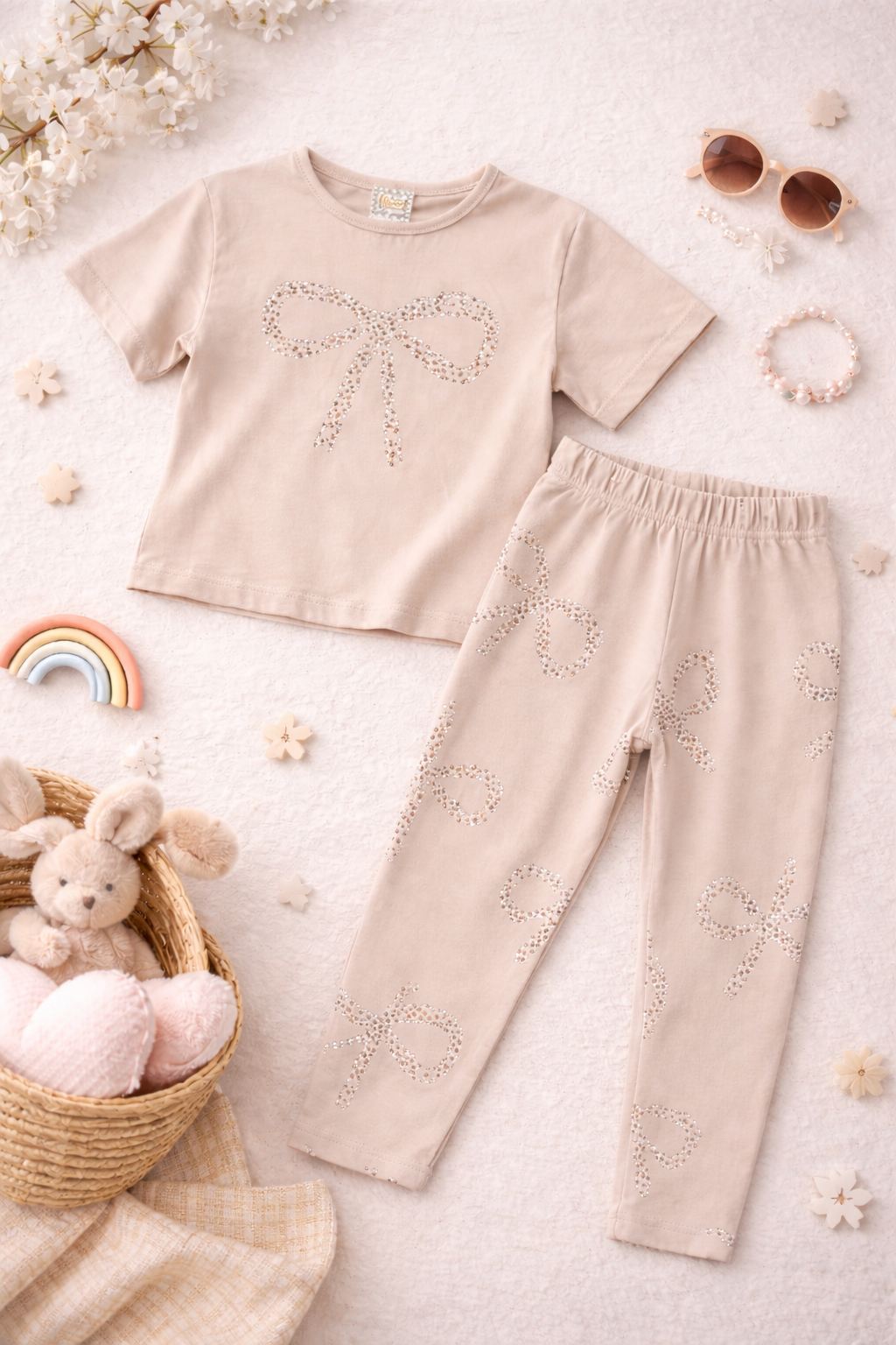 Dieses bezaubernde Mädchen-Set überzeugt mit einem liebevollen Schleifen-Design und angenehmem Tragekomfort. Das kurzärmelige Shirt wird durch eine große, dekorative Schleife auf der Vorderseite zum Blickfang, während die passende Leggings das Schleifenmotiv als Allover-Print aufgreift.